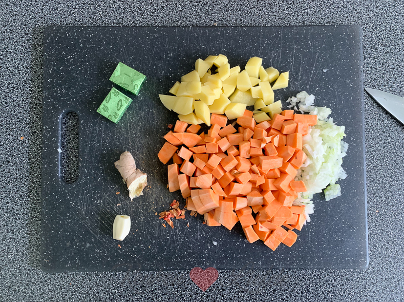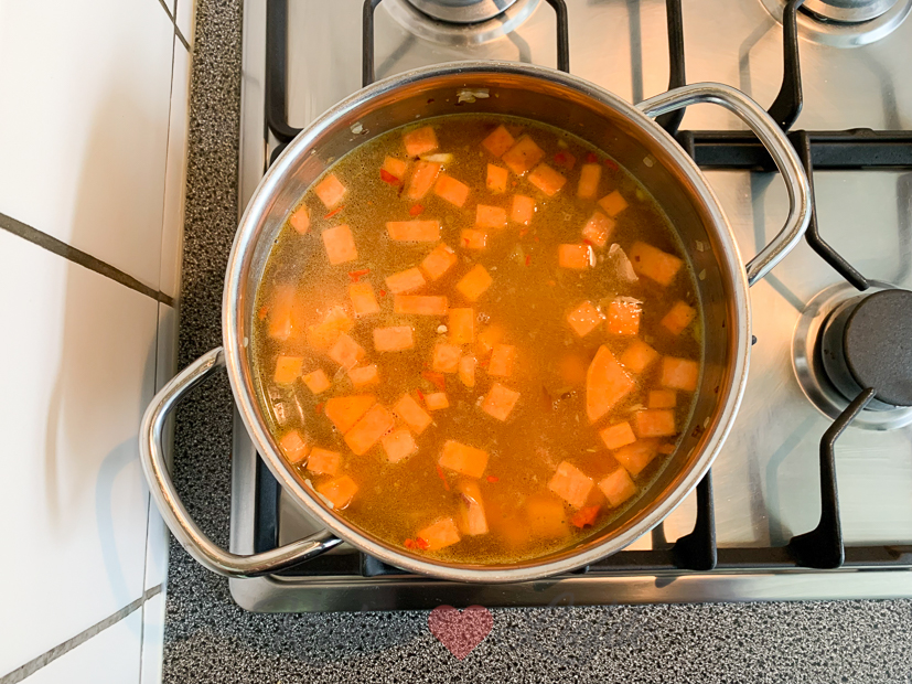 Omdat onze vriezer en kelder tjokkievol liggen wil ik de komende tijd elke dag wat uit de vriezer of kelder eten. Na een speurtocht door de kelder vind ik nog een zoete aardappel (die ligt er al maanden en is nog steeds goed!) waar ik een pannetje soep mee maak. Uit de diepvries haal ik een portie carpaccio en twee kaasschnitzels. Johan maakt hier ’s avonds twee heerlijke salades mee.