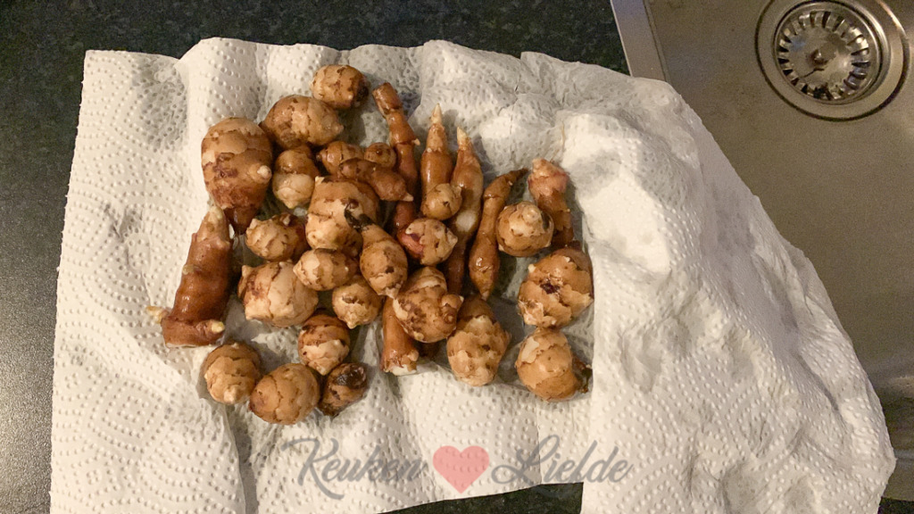 Ik had nog wat wafelbeslag met geraspte pure chocolade in de koelkast staan en besluit er pancakes van te bakken als ontbijt. Dat viel in goede aarde. ’s Middags komt er een vriendinnetje van Ella-Marie spelen. Ze maken samen loaded nachos met zelfgemaakte guacamole als lunch. Ella moet ’s avonds naar de scouting en eet iets eerder dan mij en Johan. Een salade want heeft gek genoeg heeft ze niet zoveel trek. Ik duik ’s middags de moestuin in om wat aardpeerknollen op te graven. Een van de lekkerste wintergroenten die er maar is vind ik. Nadat ik ze grondig heb gewassen snijd ik ze in flinterdunne plakjes en bak ze goudbruin en krokant in boter in de koekenpan. Later bak ik nog wat hazelnoten mee en ondertussen maak ik een romige preirisotto met Grùyere. De gebakken aardpeer en hazelnoten schep je voor serveren over de risotto. Dit recept (van HelloFresh). Ik maakte het twee jaar geleden voor het eerst en Johan en ik vonden het zo lekker dat we direct aardpeer in de moestuin plantten. In de zomer groeien er hoge stengsels uit met prachtige gele bloemen die veel aan zonnebloemen doen denken en in de winter geniet je van de knolletjes. Wij hebben hem inmiddels uit de volle grond gehaald en in een grote teil met grond gedaan omdat hij erg woekert. In een teil blijven de knolletjes wat kleiner maar voor de smaak maakt dat niets uit. Het is een groente die je niet zo snel tegenkomt in de supermarkt. Dat heeft denk ik te maken met het feit dat ze na het rooien maar kort houdbaar zijn. De smaak is aards en licht notig.