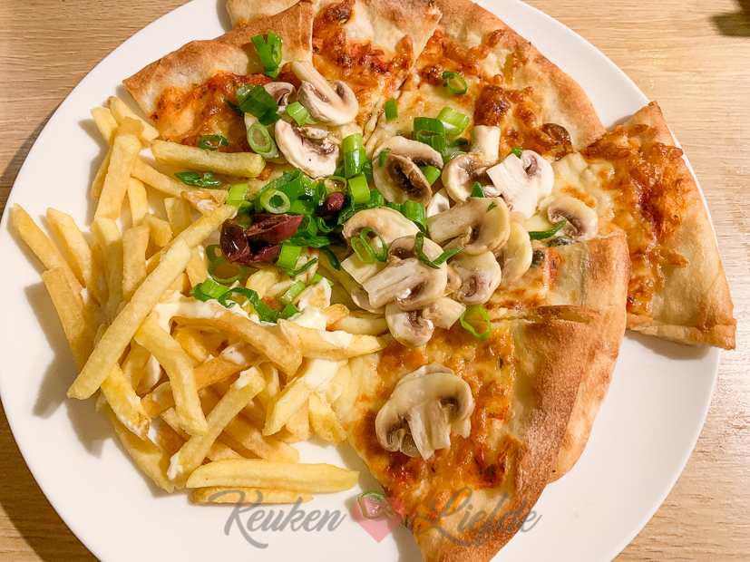 - Ik gooide wat gesneden rauwe champignons en lente-ui over mijn pizza
