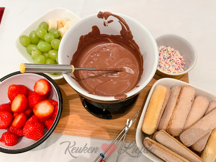 Toen ik zondag beneden kwam trof ik Johan ik de keuken aan die op het punt stond een appeltaart de oven in te schuiven. Wat een heerlijke verrassing! De pan, het pak bloem en het recept kregen we een tijdje geleden van Combekk. De zware gietijzeren double handle pan is niet het eerste waar je aan denkt om een appeltaart in te bakken, maar het was een succes kan ik je zeggen. Na het bakken komt de appeltaart heel makkelijk los en de bodem was heerlijk knapperig en krokant. Mocht je het je afvragen, de afmeting van de pan is 24 cm. ’s Avonds gingen we kaasfonduen ter gelegenheid van ons 12,5 jarige trouwjubileum van afgelopen vrijdag. We wilden het graag toch een beetje vieren en in ons geval lukt dat het beste met lekker eten. We hadden een pak kant-en-klare kaasfondue van Emmi Kaltbach (aanrader vonden wij) en erbij kwamen kipsateetjes, gehaktballetjes, stokbrood, kort geblancheerde groenten (bloemkool, broccoli, spruitjes) en paprika en aardappelkroketjes. Als afsluiting hadden we een chocolade fondue met fruit en lange vingers. Was gezellig en heerlijk.