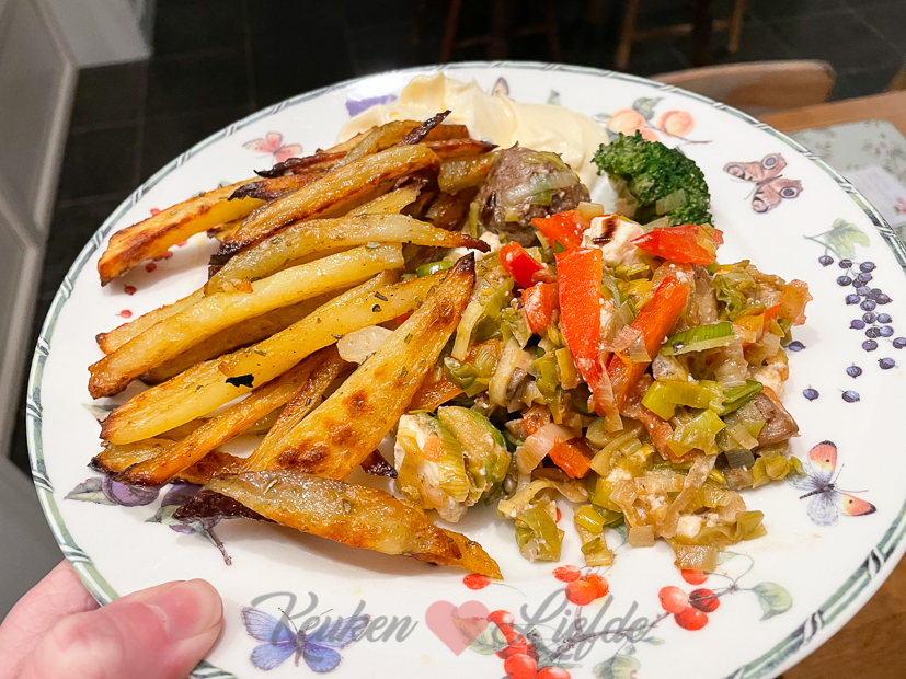 Ik begin de dag met het klaarmaken en verzenden van pakketjes voor jullie. De Keukenliefde-shop is een mooie aanvulling op de website en we vinden het superleuk om te doen. We proberen het assortiment langzaam maar zeker uit te breiden en een stijl te vinden die bij ons past. Landelijk is keyword maar daarin heb je veel verschillende stijlen. Ik heb een abonnement op het magazine Wonen Landelijke Stijl die ik verslind, ik haal er zoveel inspiratie uit. Maar vaak vind ik het te sober. Dan mis ik kleur, warmte en gezelligheid. Onze stijl zit hier een beetje tussenin en dat is wat we willen doorvoeren in ons webshop assortiment. Ons avondeten was een gebakken prutje van bij elkaar gesprokkelde groenten, opgewarmde gehaktballetjes en zelfgesneden ovenfrietjes. Zag er totaal niet smakelijk uit maar dat was het wel.