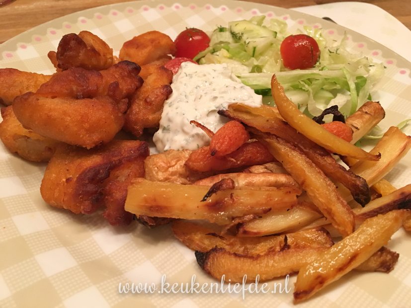 Na het maken van de gezonde kapsalon maakte ben ik fan van groentefrietjes uit de oven. Vandaag staan ze weer op het menu, maar dit keer serveer ik ze met kibbeling, ook uit de oven. Erbij serveer ik wat ijsbergsla en zelfgemaakte remouladesaus. Jam! Trouwens, dit is een heel lekker recept voor zelfgemaakte kibbeling!