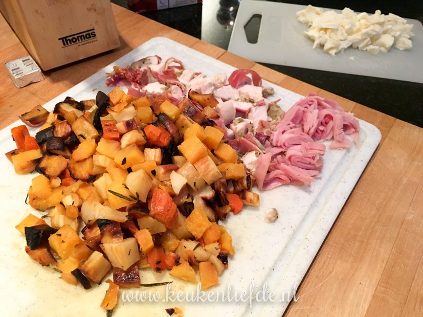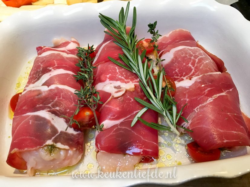 Ik maak (alweer) groentefrietjes — koolraab, pastinaak en wortel — en serveer ze dit keer met pesto en mozzarella gevulde kipfilet omwikkeld met rauwe ham uit de oven. (dit recept alleen dan met mozzarella erbij) Bij de kipfilet in de ovenschaal sprenkel ik wat witte wijn en olijfolie en ik leg er wat gehalveerde cherrytomaatjes en een takje tijm en rozemarijn bij. Zo krijg je een heerlijke jus.
