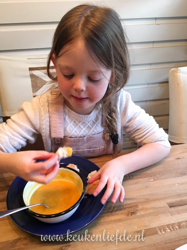 We eten ’s avonds de pompoensoep die vanaf nu de nieuwe soepfavoriet is van dochterlief.