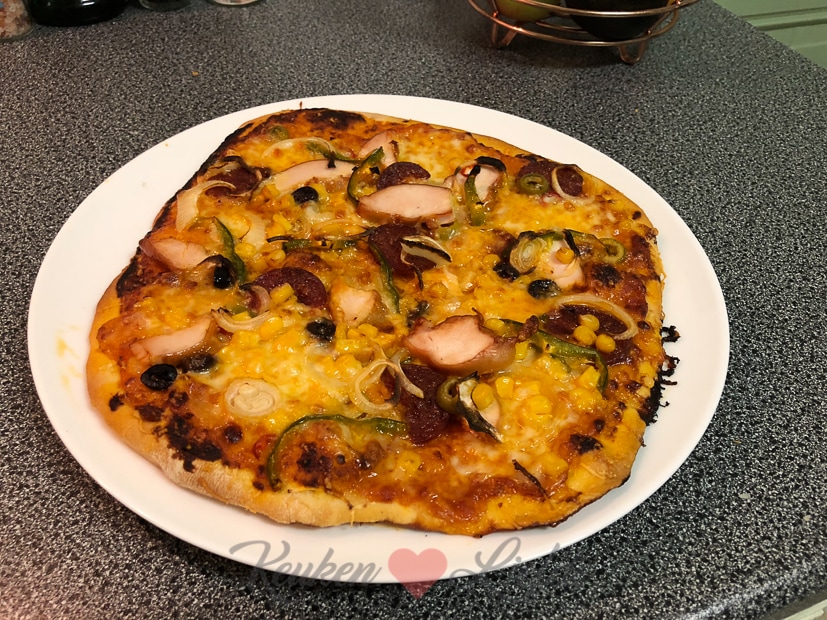 Ik trek mijn Kenwood keukenmachine weer eens tevoorschijn om zelf pizzadeeg te maken. Dat was alweer veel te lang geleden. De laatste tijd aten we meestel kant-en-klare diepvriespizza, maar die kan in de verste verte toch niet tippen aan zelfgemaakte pizza. De foto verdient misschien geen schoonheidsprijs, maar geloof me als ik zeg dat het lekker was!