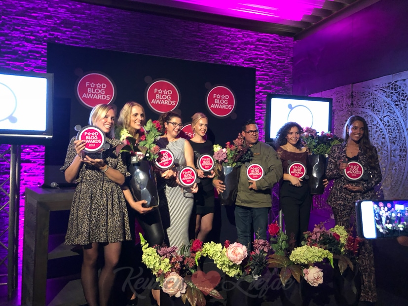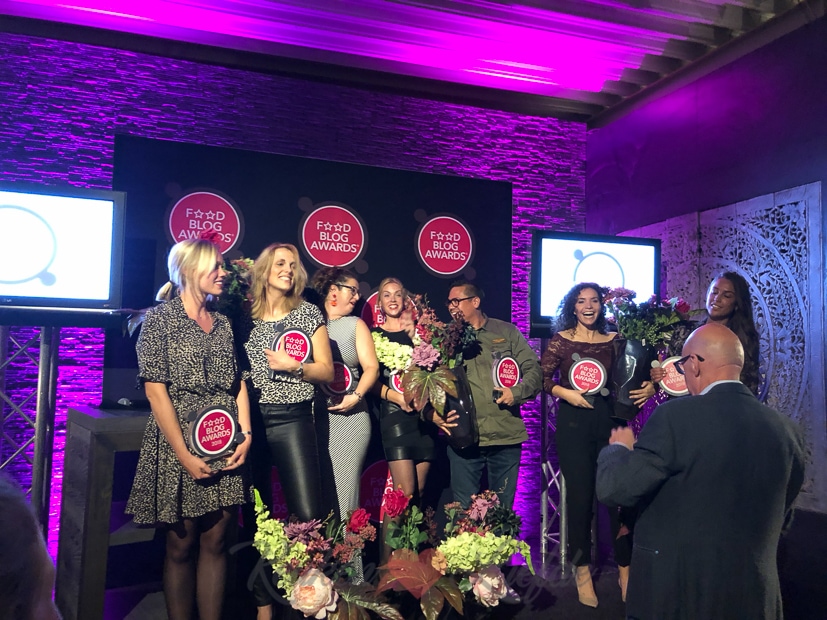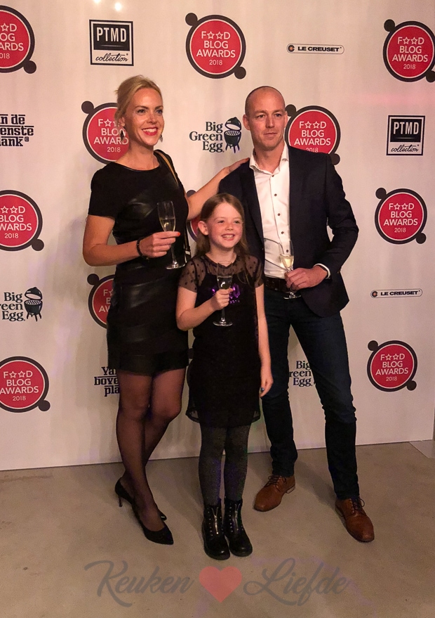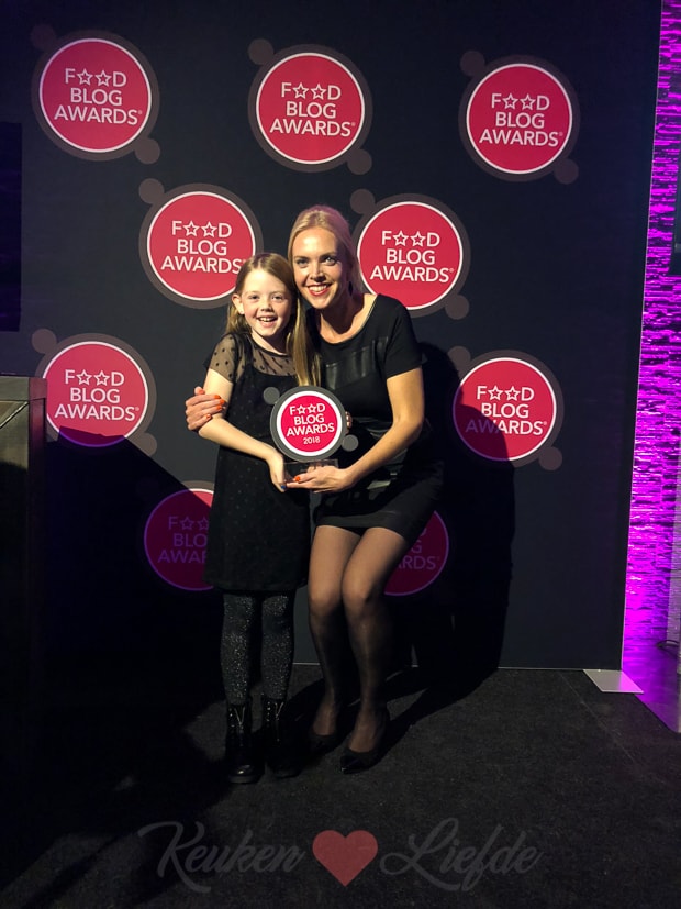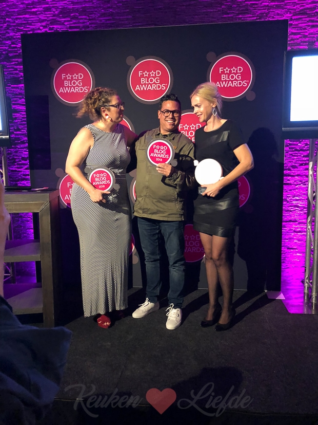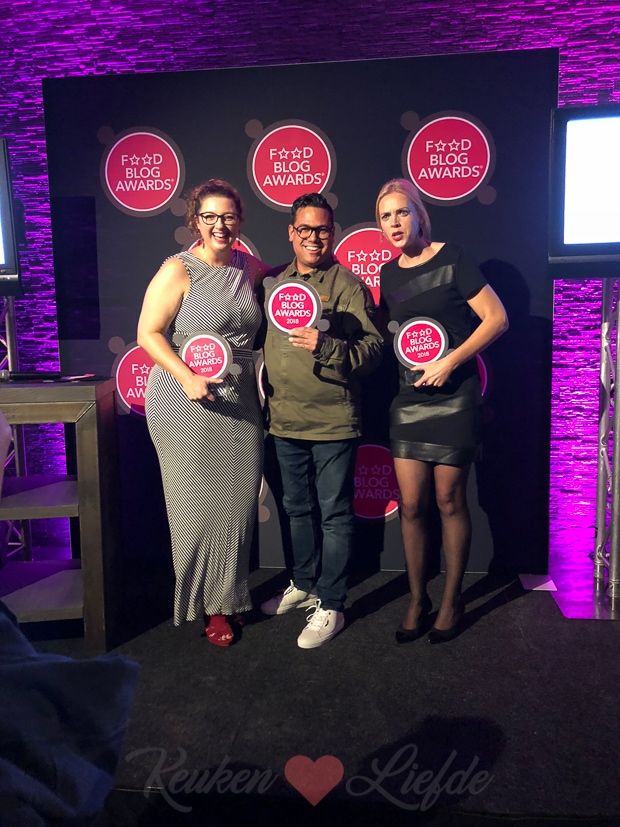 We gingen de laatste stemrondes in en wederom riepen we iedereen op om te stemmen op Foodblog van het jaar en linkten (schrijf je dat zo?) we wederom alleen maar door naar die stempagina. En dan komt het vreemde: we winnen de award voor beste food foto… Huh??? Zo stond ik dan ook op het podium te kijken toen ik de award overhandigd kreeg. Met een bek vol tanden. Begrijp me niet verkeerd, het is een prachtige award om te krijgen, maar ik heb het gevoel dat wij de award hebben gewonnen als soort van troostprijs en dat vind ik vervelend. De andere finalisten (helaas kan ik op de site van de foodblogawards niet meer zien wie dat waren) voor deze award hebben zich wellicht wel zelf aangemeld omdat ze een foto hebben waar ze waanzinnig trots op zijn (er zaten waanzinnig mooie foto’s tussen!) en waarvoor ze hun volgers hebben opgeroepen om hierop te stemmen. Omdat we er een vervelende nasmaak aan overgehouden hebben, hebben we besloten om volgend jaar niet meer mee te doen met de Foodblog Awards. Ik weet dat er héél veel gestemd is op ons voor foodblog van het jaar en ik wil nogmaals IEDEREEN daarvoor bedanken!!!! Jullie zijn de beste! Hierbij toch wat leuke kiekjes van de avond, want ik gun iedereen haar en zijn award van harte en ik twijfel er niet aan dat die meer dan verdiend zijn. Alle bloggers verdienen trouwens een award, want hoewel we het mooiste werk van de wereld hebben, we werken er bikkel- en bikkelhard voor! Hier vind je trouwens alle winnaars van de Foodblog Awards. PS Ik ben niet zo’n prater en neem bijna nooit de moeite om ergens op te reageren maar toch wilde ik dit even kwijt. Hopelijk heb ik goed verwoord wat mij dwars zit en kwets ik hier niemand mee, want dat is niet mijn bedoeling!