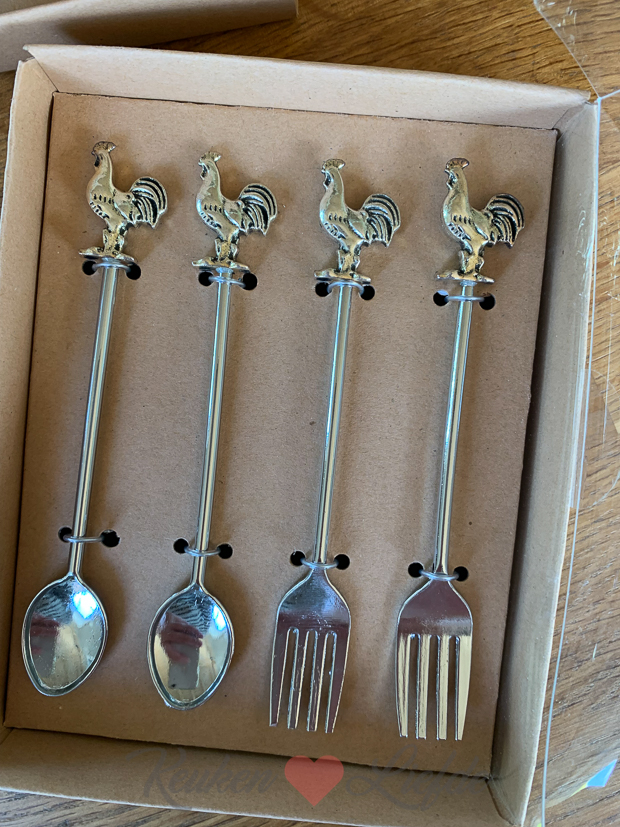 - … deze lepels en gebaksvorkjes met haantje
