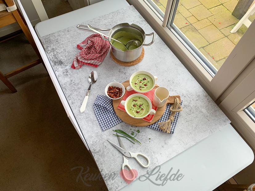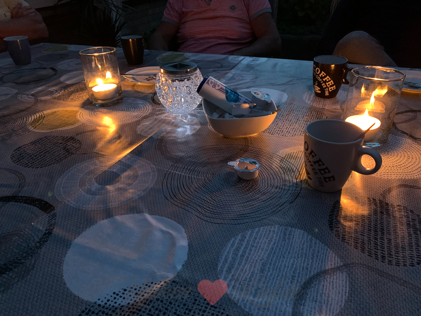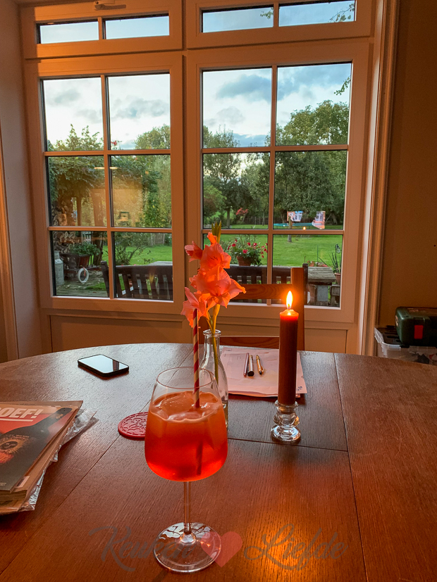 Een nieuwe week begint. De laatste week waarin we kunnen koken want aankomend weekend moeten we de keuken leegpakken. Volgende week maandag en dinsdag komt de stucadoor de wanden in de keuken stucen en de week daarop worden de tegels in de keuken gelegd. Dat betekent dus dat we 2 weken zonder keuken zitten. In november wordt de hele keuken geschilderd en kan de keuken weer een week niet worden gebruikt. Gelukkig heb ik inmiddels een voorraadje recepten opgebouwd en verder zien we wel hoe het loopt allemaal. Geen zorgen (of in ieder geval niet teveel!) voor de dag van morgen. Vandaag zit ik een groot deel van de dag op kantoor en ’s middags maak ik nog de laatste foto’s van producten voor de webshop. Eind van de middag loop ik een rondje door de moestuin en kan weer behoorlijk wat courgettes plukken en twee rode pepertjes. Ik besluit meteen maar een pan courgettesoep te maken voor het avondeten. Ondertussen maait Johan het gras. Omdat Ella op tijd naar voetbaltraining moet eet ze wat eerder dan ons. Johan en ik rommelen nog wat in de tuin en in huis als Ella weg is en voordat we gaan eten drinken we een drankje in de keuken. Kaarsje aan en genieten maar.