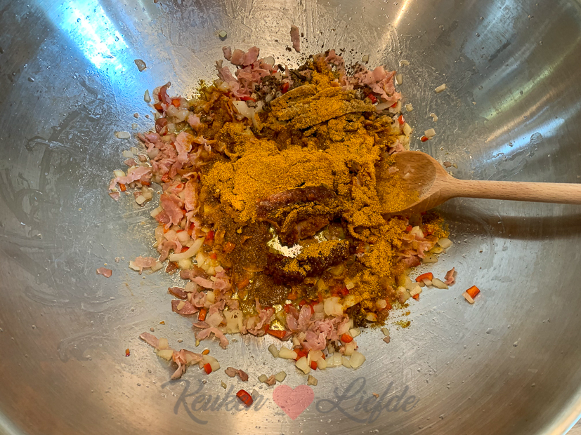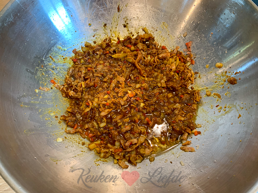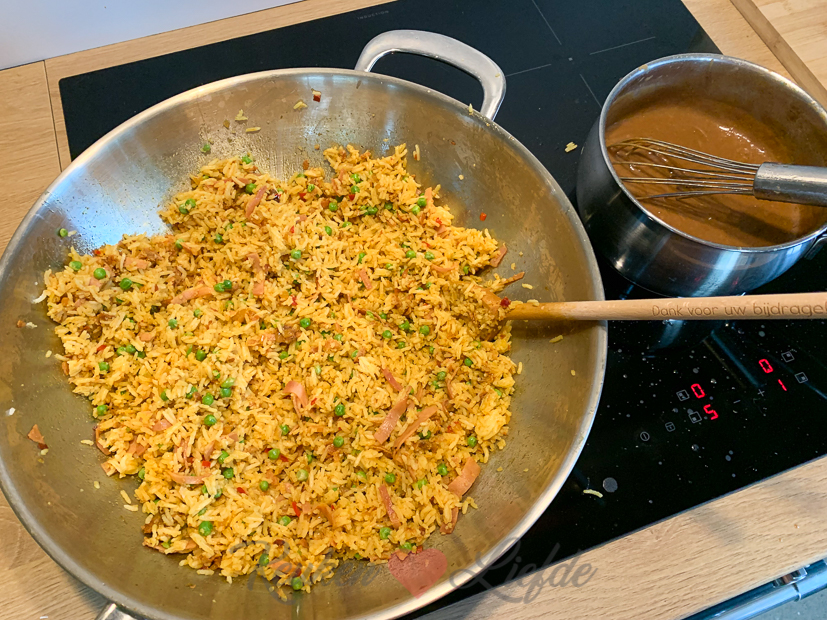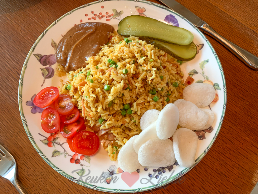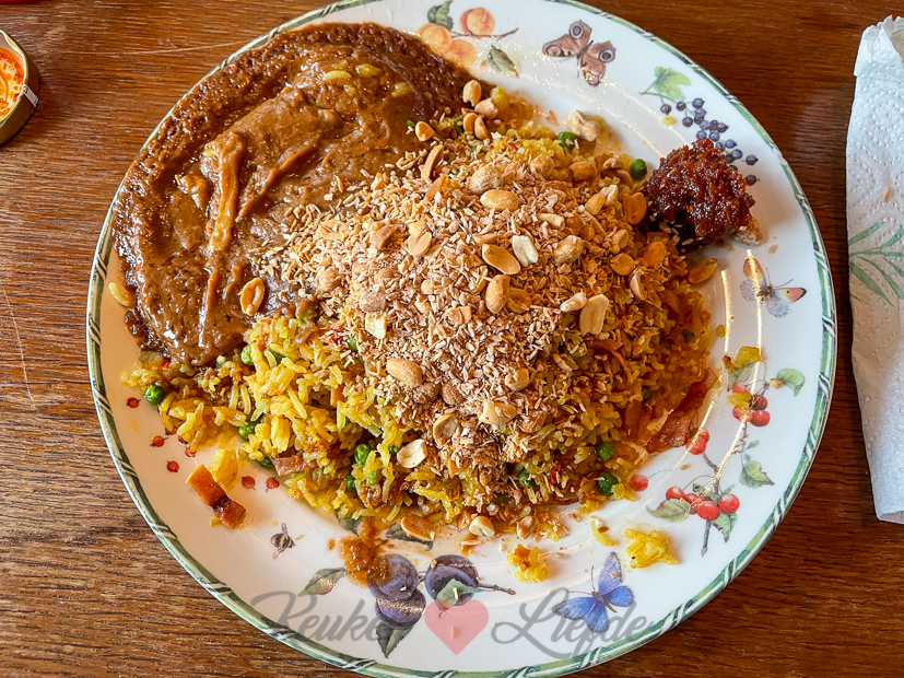- Uhm, ergens onder die berg pindasaus en seroendeng ligt wat nasi… 🤭 Niet mijn (Annemiek) bord!