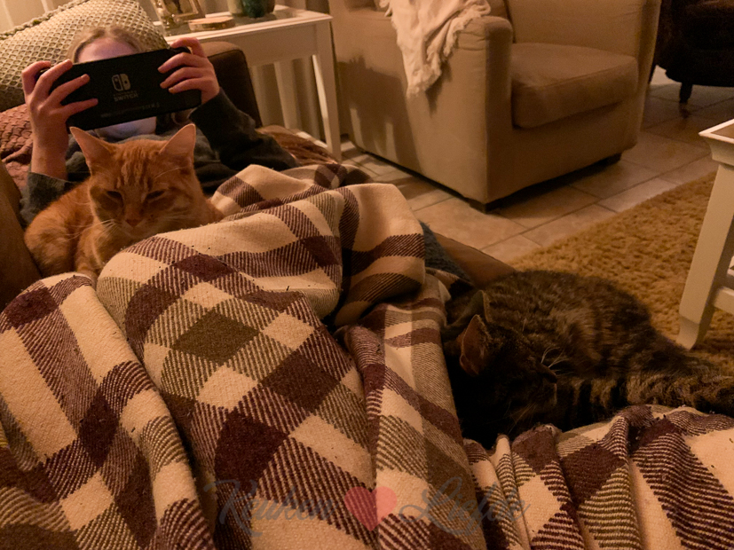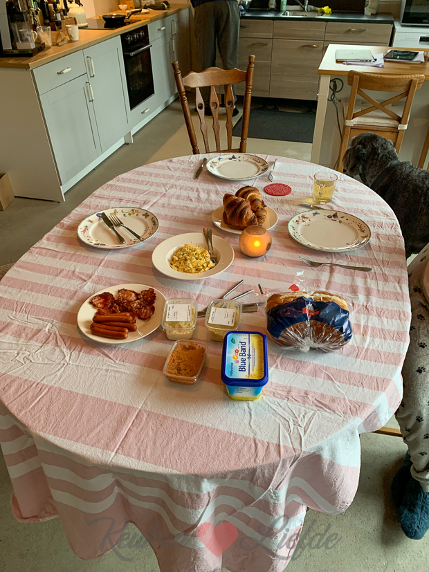 Uitslapen en met z’n allen aan tafel ontbijten; dat is een goed begin van de zondag! (De kreukels in het tafelkleed moet je maar even wegdenken, het was een spontane ingeving 🙄) Het regent de hele dag dus we vermaken ons verder met spelletjes spelen en lekker lui zijn. ’s Avonds eten we bloemkool met een kaassausje (uit een pakje), een gebakken kipschnitzel en zelfgemaakte ovenfrietjes.