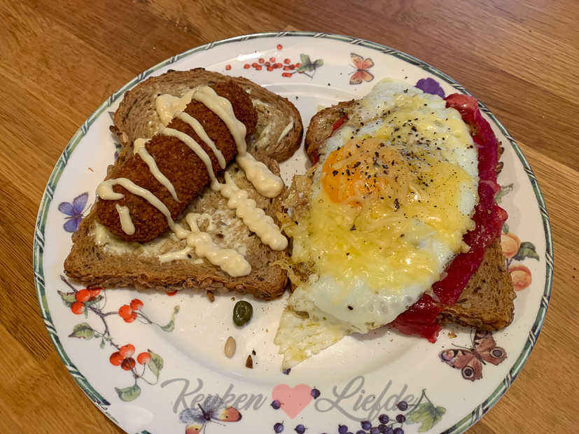 Daarna rijd ik nog even door naar mijn ouders om een exemplaar van ons kookboek te brengen. Onderweg naar huis haal ik nog snel wat boodschappen en ik ben net op tijd weer thuis voordat Ella thuiskomt uit school. Bij thuiskomst lagen er ook twee pakketjes op me te wachten: het nieuwe kookboek van Francesca Kookt (samen met een mooie set ansichtkaarten en menukaarten voor haar interactieve belevingsspel voor aan tafel) en eersteklas olijfolie uit Puglia van Olivery. In mijn stories zag je ze al voorbijkomen. Daar word je blij van op de vrijdag! Johan ging ’s avonds aan de slag met het avondeten. Hij belegde lekker brood met een kroketje en met carpaccio en een gebakken ei. Was heerlijk!