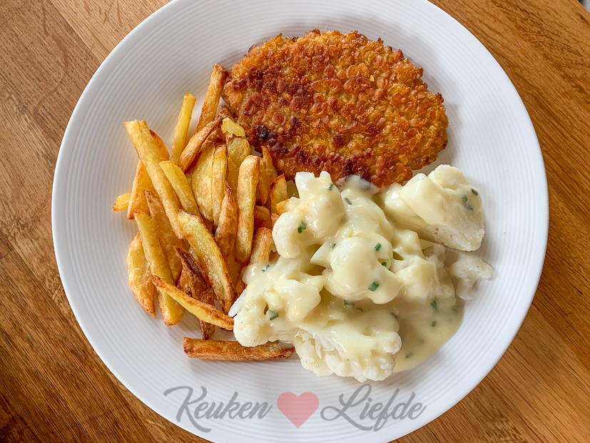 - Bloemkool met kaassaus, ovenfrietjes en een kipschnitzel