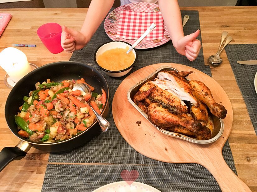 ’s Avonds eten we hele kip met mijn zelfgemaakte appelmoes en een aardappelpannetje met groenten.