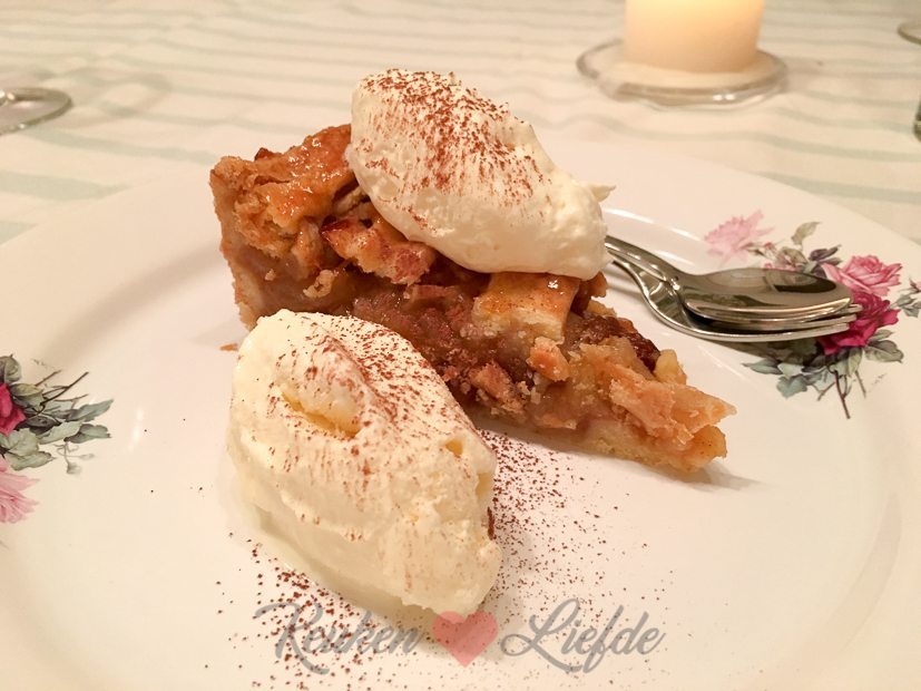 We serveren de coq au vin met zelfgesneden verse friet, gekookte sperziebonen, stokbrood en salade gemaakt door Ella-Marie. Als toetje is er appeltaart met vanilleroomijs en slagroom. Was een topavond.
