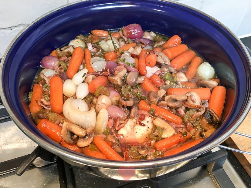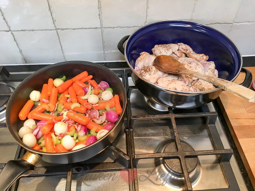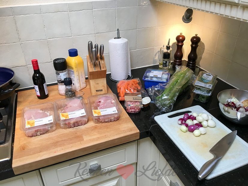 Vanavond komt een vriend bij ons eten. Ik begin ’s ochtends met de voorbereidingen. Ik bak een appel-speculaastaart (recept volgt) die vanavond als toetje op tafel komt en maak coq au vin voor het hoofdgerecht.
