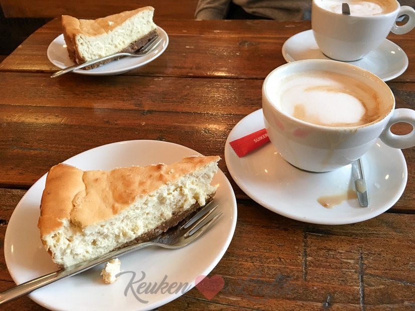 Ik spreek af met vriendinnetje Renée om even gezellig bij te kletsen onder het genot van cappuccino en cheesecake. (Zelf een lekkere cheesecake bakken? Dit is mijn favoriete cheesecakerecept!)
