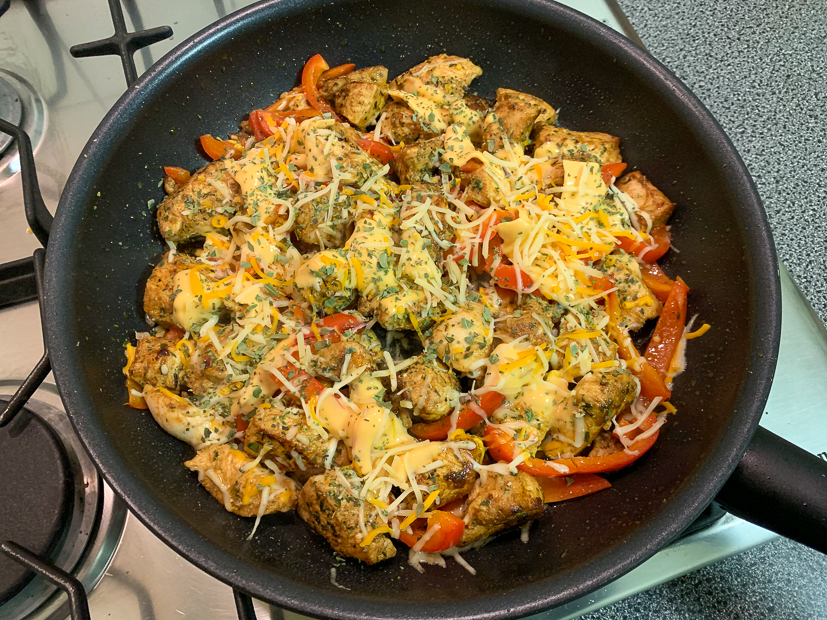 - Ik laat wat cheddar en geraspte kaas over de kipshoarma smelten