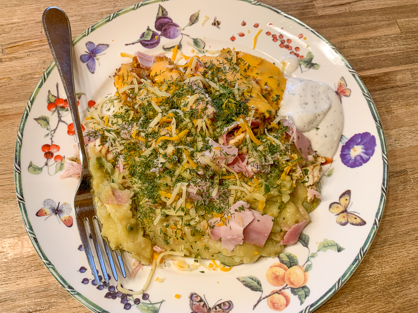 ’s Ochtends had ik een bak met witlofstamppot uit de vriezer gehaald die ik ’s avonds alleen maar hoef op te bakken. Ik bak er nog kipschnitzels bij waar ik een plakje cheddar overheen laat smelten.
