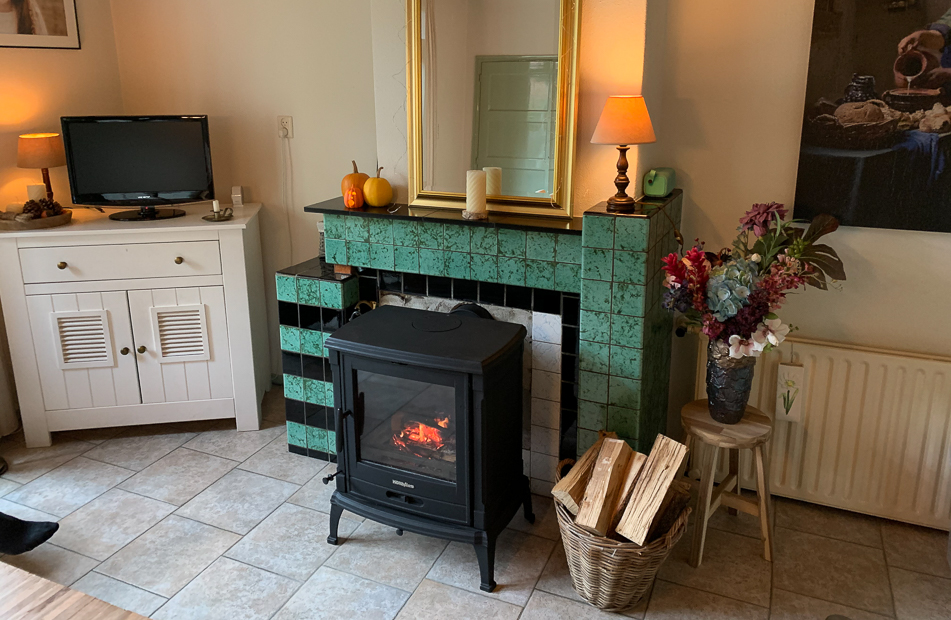 Als we naar binnen gaan trekken we ons makkelijke huispak aan en steken de houtkachel aan.