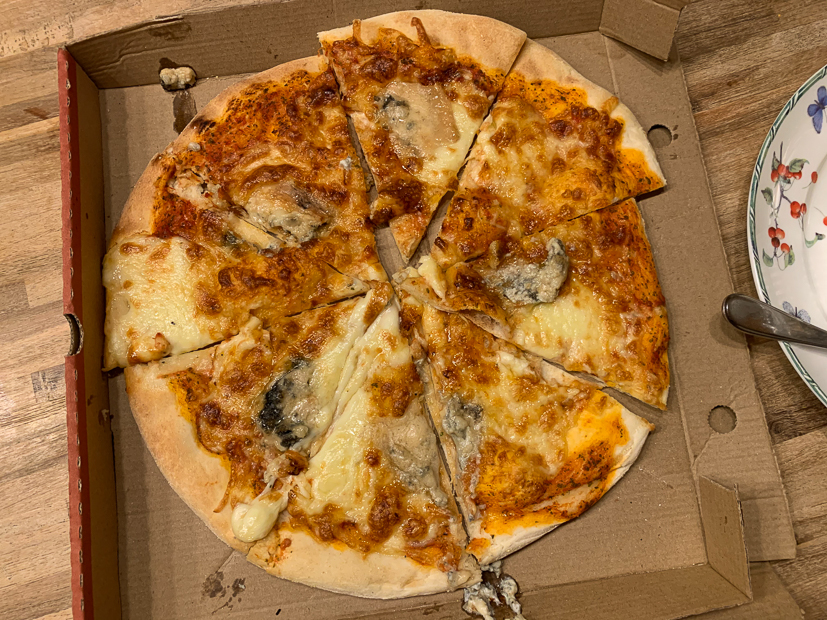 We hebben ook geen zin meer om te koken en laten eten thuisbezorgen. Ik (Annemiek) neem een pizza quattro formaggi, Johan een kapsalon en Ella een frietje.