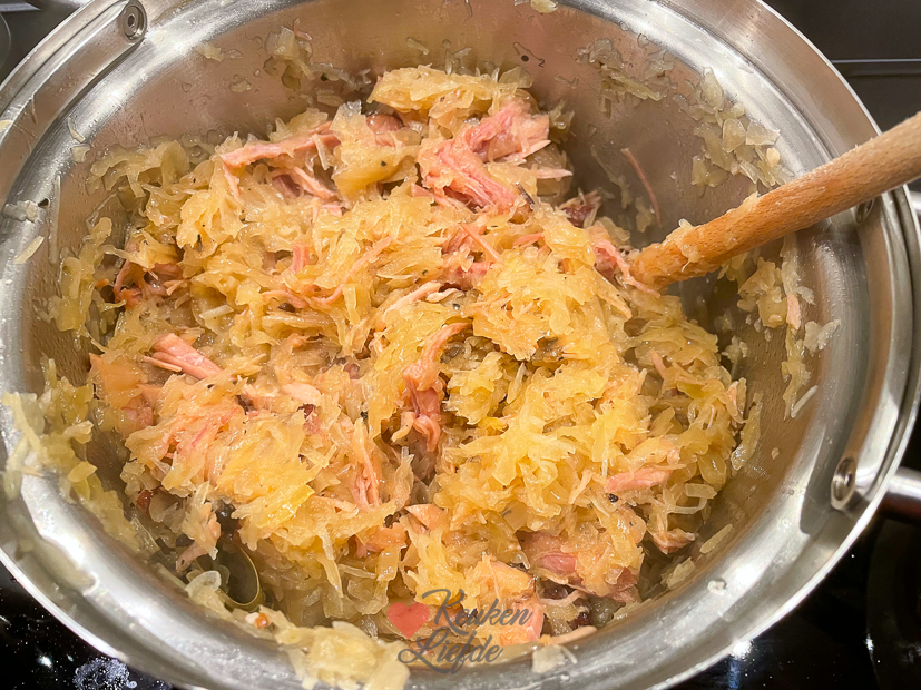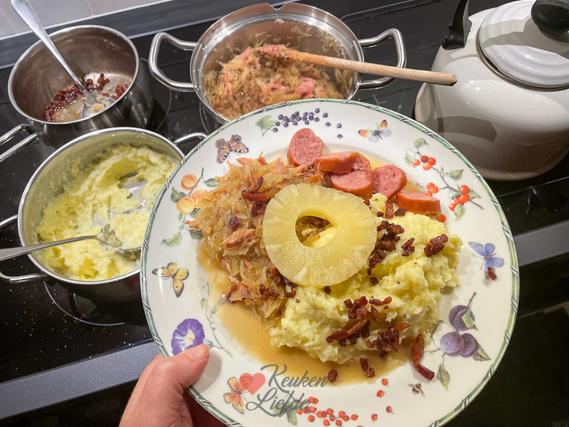 En weer een nieuwe week! Niet normaal toch, hoe snel de tijd gaat? Vandaag is weer een maandag zoals altijd. Johan en Ella zijn vroeg de deur uit en ik werk thuis op kantoor. ’s Middags maak ik zuurkool en zet hem op de foto zodat ik het recept met jullie kan delen. Ik bereid zuurkool anders dan de meeste Nederlanders en ik denk echt dat als je hem zo gegeten hebt, je nooit meer anders wil. ’s Avonds maak ik aardappelpuree, warm ik een rookworst op en bak ik spekjes uit om bij de zuurkool te serveren. Ook een plak ananas mag niet ontbreken. Gruwelijk lekker!