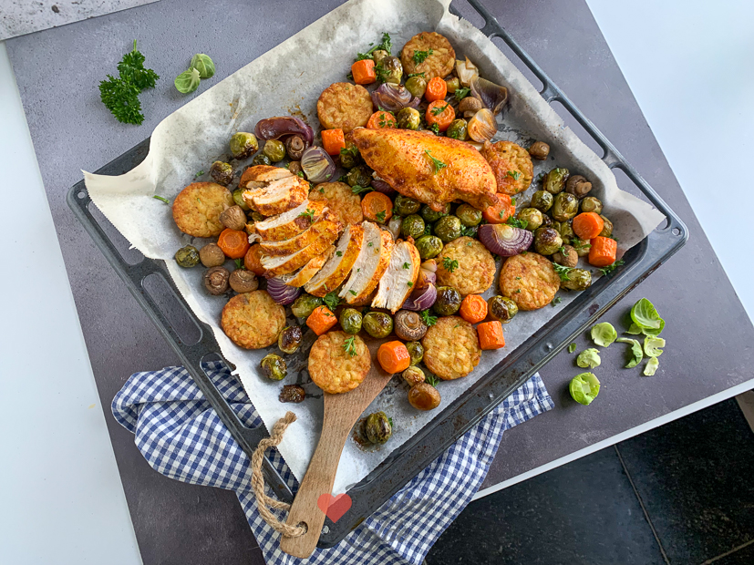 Ik maakte vandaag één nieuw recept voor KL: een makkelijke traybake met spruitjes, wortel, rösti en kip. Traybakes zijn geweldig. Je kunt er eindeloos mee variëren en omdat de oven al het werk doet heb je (bijna) geen afwas. Deze variant met röstirondjes was ook weer een succes. Maak jij weleens een traybake en heb je een favoriet qua ingrediënten? Laat het me weten in een reactie hieronder. Ik ben heel benieuwd!
