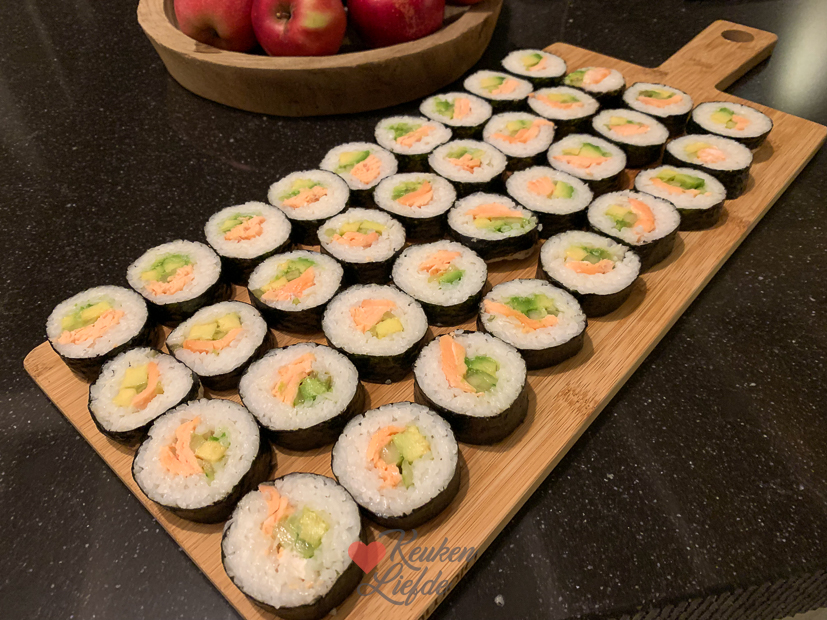 Het is heerlijk dat we eindelijk de tafel en stoelen voor in de keuken hebben uitgezocht want nu hebben we de zaterdag weer vrij voor andere dingen. Ella-Marie heeft ’s ochtends een uitwedstrijd van de voetbal en terwijl Johan even gaat kijken, maak ik nog snel een recept voor KL. Ik had deze week weinig voor KL gekookt en ik wil toch een voorraad opbouwen, zodat ik in december een beetje rustig aan kan doen. Als het KL-recept op de foto staat ga ik meteen door met het maken van een aantal sushirollen. Ella wilde graag weer eens sushi eten voor de tv met een filmpje. Ik hield de rollen dit keer eenvoudig en maakte twee varianten met in de oven gegaarde zalmfilet en tonijn uit blik. En verder avocado en komkommer. Als je niet van vis houdt kun je ze ook vullen met gerookte kip, of ze vegetarisch maken. De sushi zetten we op tafel met toppings: ingelegde gember, gefrituurde uitjes, furikake, Kewpie, sojasaus en wasabi. Iedereen legt dan wat sushi op zijn bord en doet er naar smaak toppings overheen. Om mooie sushirollen te maken gebruik ik deze sushimaker. Daarna duw ik de rol op een norivel en rol hem op. Daarna als een toffee strak inwikkelen in vershoudfolie en nog een paar uurtjes in de koelkast leggen. Dan kun je ze straks perfect snijden. Als de sushirollen in de koelkast liggen komt mijn broer nog even langs om appels te plukken. Eind van de middag gaat de houtkachel aan en is het tijd om te genieten.