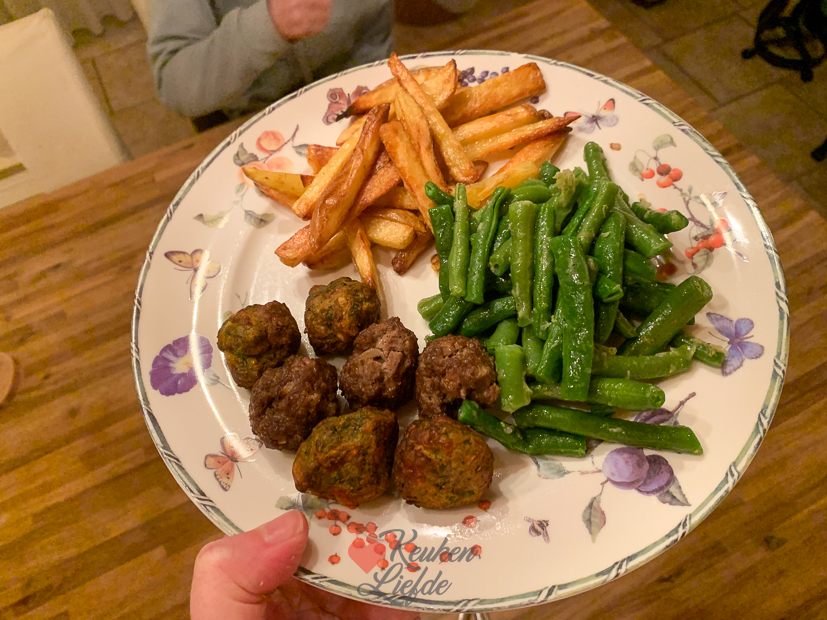 Johan vermaakt zich vandaag in de tuin met onder andere het opruimen van de schuur en het opruimen van blad. Tijdens het opruimen van de schuur komt hij een verroest voetbaldoeltje tegen met daarin een egel die verstrikt is geraakt in het net. De arme egel kon geen kant meer op. Nadat Johan voorzichtig de egel bevrijd heeft van het net zet hij hem achter in de tuin in een doos met wat bladeren, water en kattenbrokjes. Hij dekt de doos af met een plaat zodat de egel rustig bij kan komen van zijn avontuur (en Nacho en de katten er niet bij kunnen) en al snel hoort hij de egel in de doos weer tot leven komen. Niet veel later als we weer gaan kijken is de doos leeg. Johan had een kleine opening in de doos gelaten en blijkbaar was de egel sterk genoeg om eruit te klimmen. We konden hem ook nergens meer vinden. Het ga je goed vriend! ’s Avonds eten we zelfgesneden frietjes uit de oven, gehaktballetjes (zelfgemaakte van rundergehakt en vegaballetjes van de IKEA) uit de Airfryer en gekookte sperziebonen. Was heerlijk.