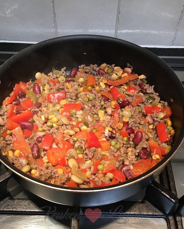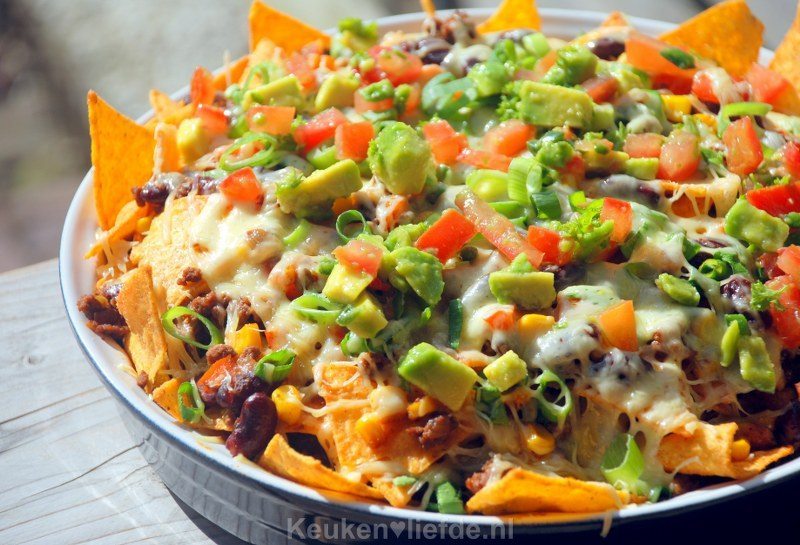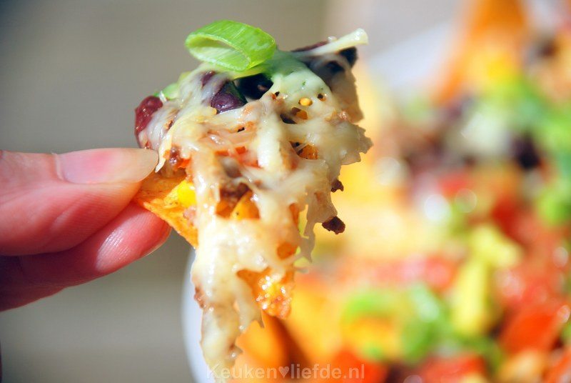 Als El op bed ligt eten Johan en ik met het bord op schoot voor de tv: loaded nachos! Dit onderstaande recept: