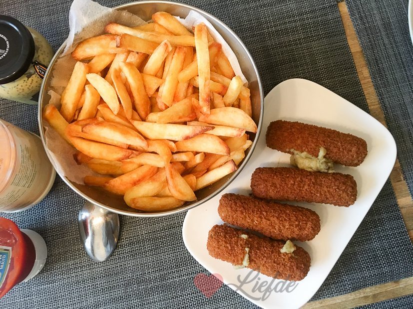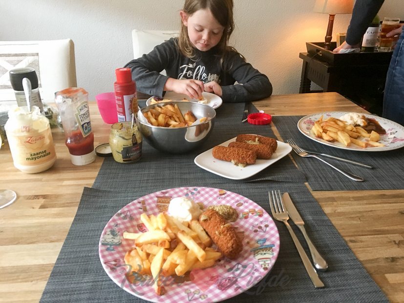 Ik had nog wat frietaardappels liggen die op moesten, dus ’s avonds eten we zelfgemaakte friet met ovenkroketten.