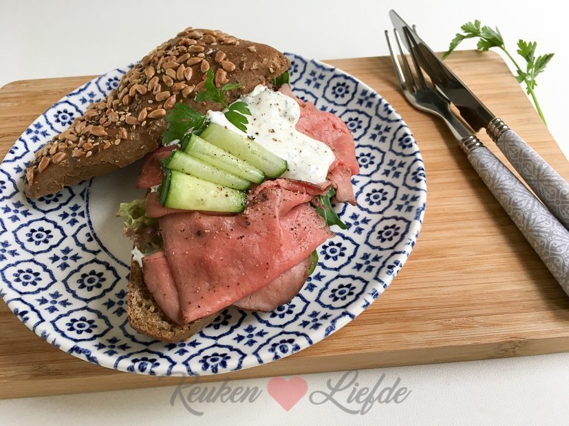Ik lunch met een broodje rosbief met zelfgemaakte kruidenmayonnaise, sla en komkommer. Erg lekker!