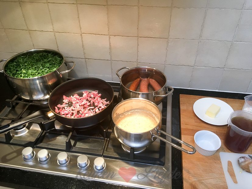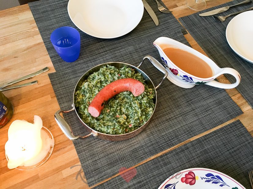 Johan en ik zijn allebei snotverkouden en ik besluit om een pan boerenkoolstamppot te maken. Met spekjes, rookworst en jus erbij. Dat zal die ziektebacillen leren. Recept komt eraan.