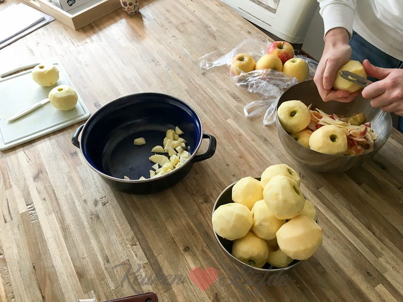 Ella-Marie wordt ’s ochtends opgehaald door Johan zijn ouders en neefje Levi om samen te gaan zwemmen. Als ze weg zijn gaan Johan ik aan het werk in de keuken. Ik heb morgen een draaidag voor een hele leuke campagne (binnenkort vertel ik je er meer over) en daarvoor moet ik alvast wat voorbereidingen treffen: we schillen maar liefst 5 kg appels! 🙂