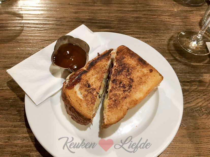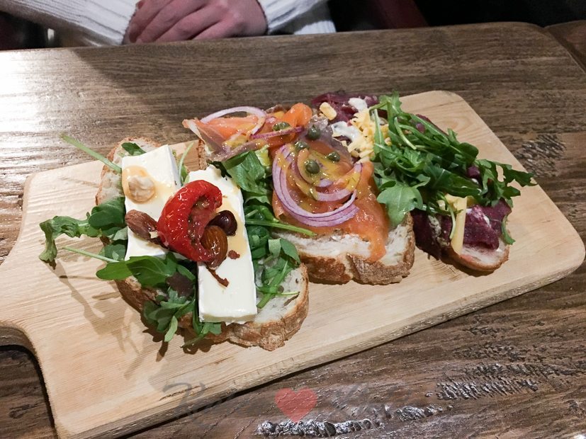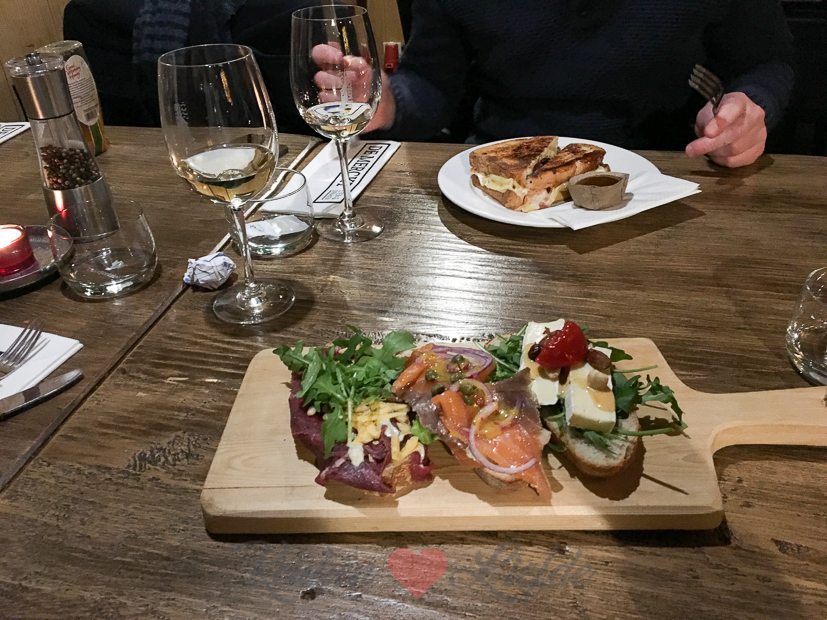 ’s Middags gaan we met z’n drieën lunchen bij De Merckt in Tiel. El en ik nemen een De Merckt trio: drie sneetjes brood met zalm, carpaccio en brie en Johan neem een tosti met geitenkaas, stoofpeer en noten. Smullen!