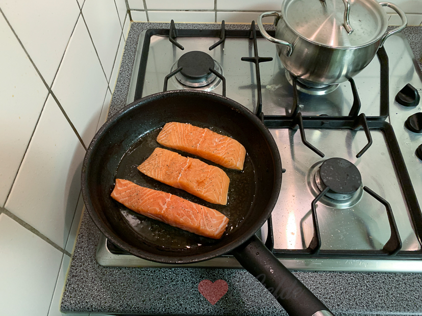 - Zalm-bak-tip! Als je zalm te hard bakt (hoog vuur) dan gaan de eiwitten in de zalm stollen (zie gestolde eiwit dat uit de zalm komt). Ziet er niet zo smakelijk uit, dus rustig bakken op lager vuur.