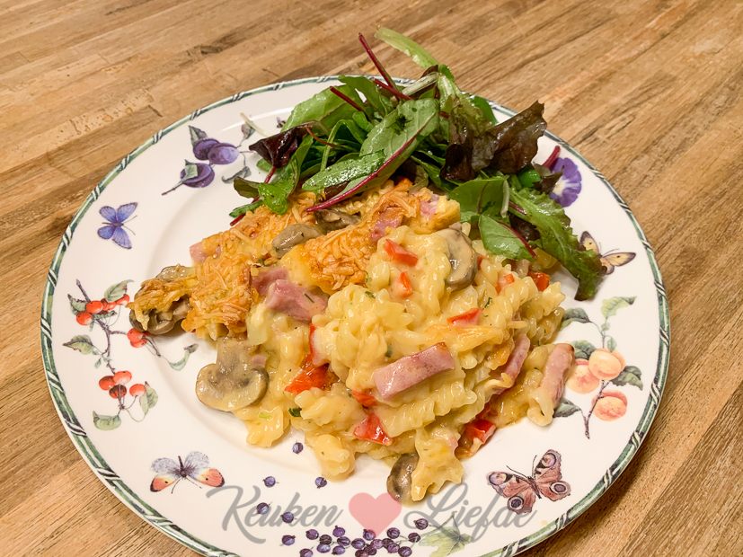 ’s Avonds maak ik een pasta-ovenschotel met salade. Ik gebruikte zo’n zakje sausmix voor ovenpasta van Knorr. Die vond ik vroeger heerlijk en handig want je kunt de pasta en groenten ongekookt en rauw in de ovenschaal doen. Sausmix loskloppen met water, eroverheen gieten en de oven doet de rest van het werk. Smaakte best oké, maar de pasta was veel te zacht terwijl ik hem 10 minuten korter in de oven had gedaan dan omschreven stond. Toch maar weer eens zelf experimenteren om dit gerecht zelf te maken zonder zakje. Bij deze ovenpasta met prei en ham hoef je de pasta niet voor te koken, maar maak ik wel eerst een bechamelsaus. En soms is zelfs dat teveel werk! Ik wil dus een zelfgemaakte sausmix maken zonder te koken, die je zo over de rauwe pasta en groenten kunt gieten en de oven in kunt schuiven. Wordt vervolgd…