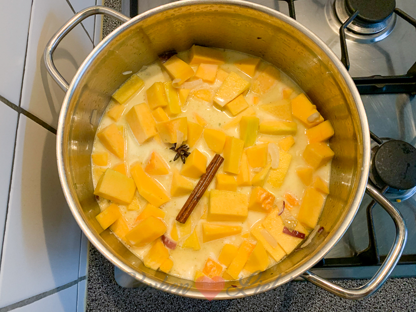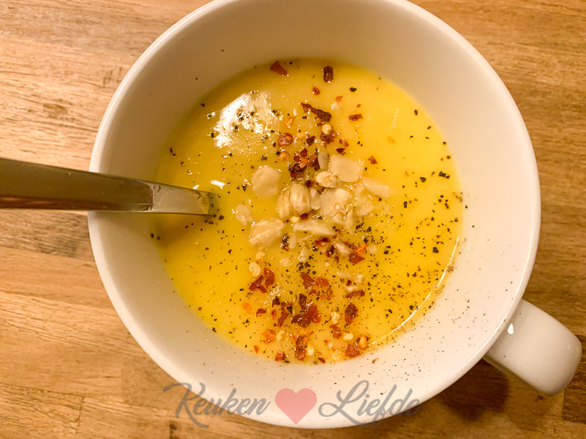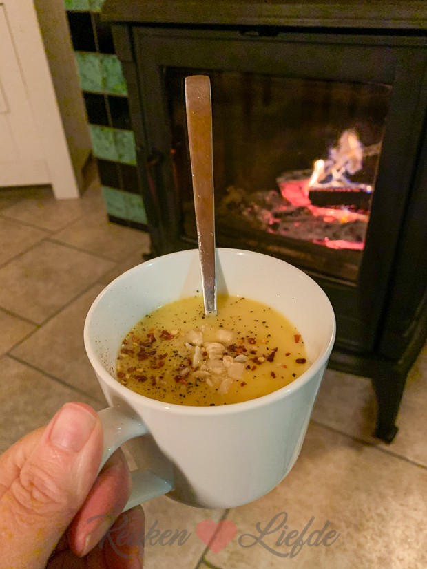 Voor het avondeten maak ik heerlijke pompoensoep met flespompoen die we kregen van Johan zijn tante. Ik maakte dit recept, onze favoriet.