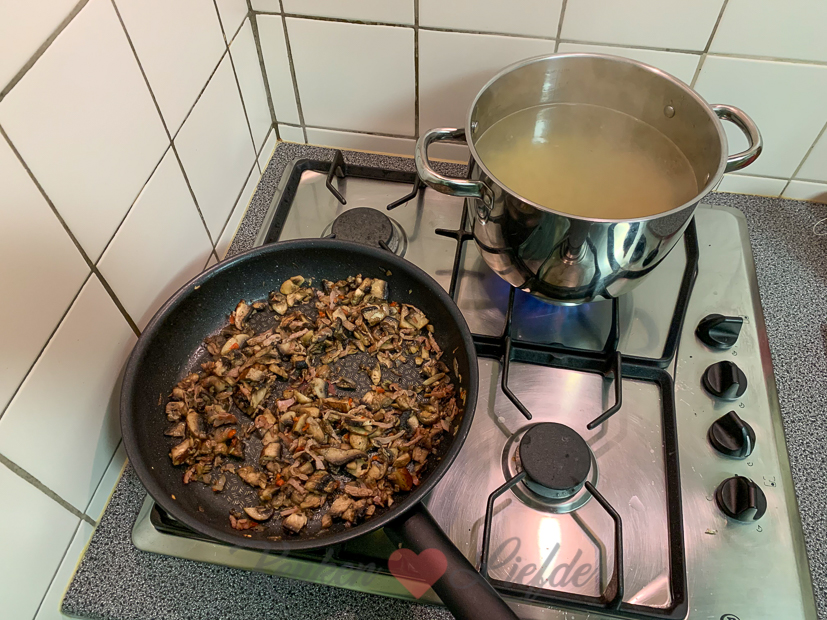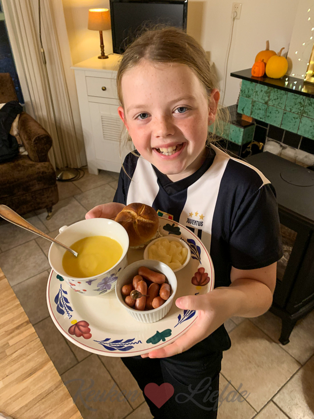 Ella-Marie eet ’s avonds een kommetje pompoensoep met knakworstjes voordat ze naar voetbaltraining moet. Johan en ik eten pasta carbonara met champignons.