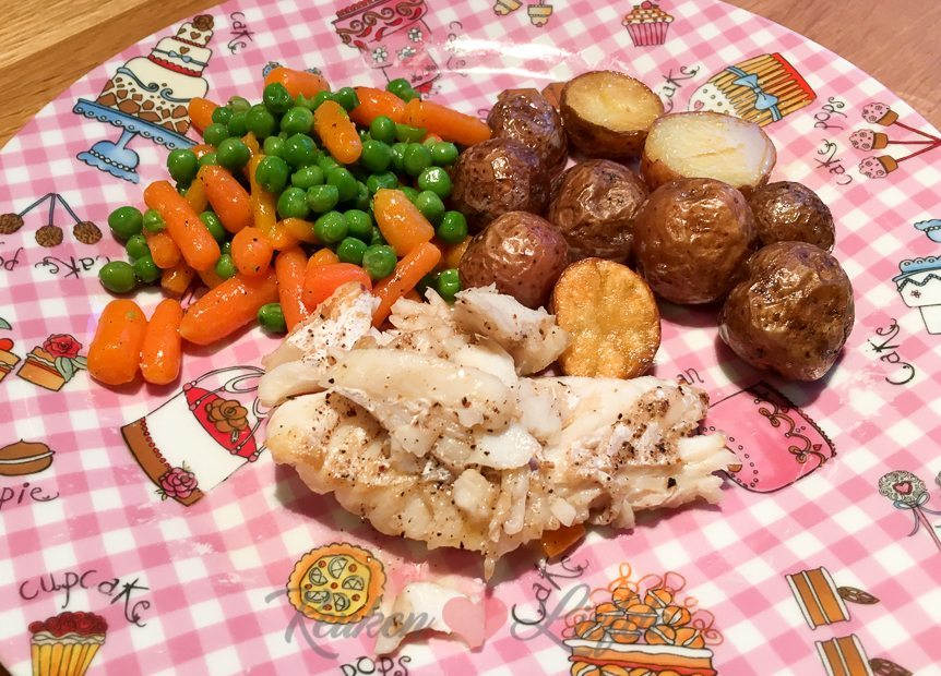 We eten gebakken kabeljauw (hij valt helemaal uit elkaar tijdens het bakken, maar de smaak is er niet minder om), gekookte en gebakken krieltjes in de schil en wortels en doperwten. Simpel en heel erg lekker!