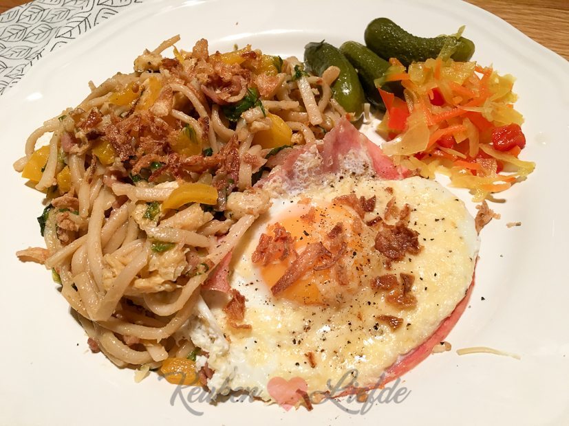 We eten de overgebleven bami met andijvie met een plakje ham en een spiegeleitje erbij.