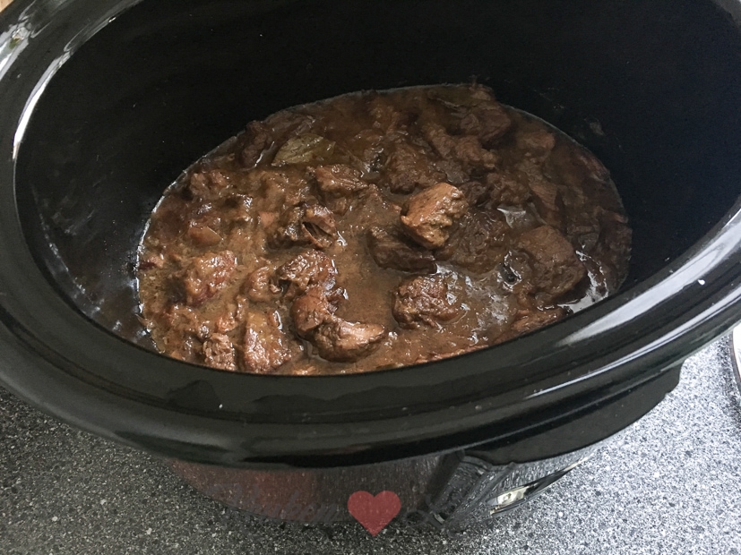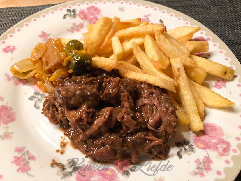 ’s Avonds eten we eindelijk het stoofvlees dat ik donderdag al maakte met zelfgemaakte frieten erbij en wat groenten van gisteren uit de braadslee. Helaas niet een geweldige foto maar lekker was het wel!
