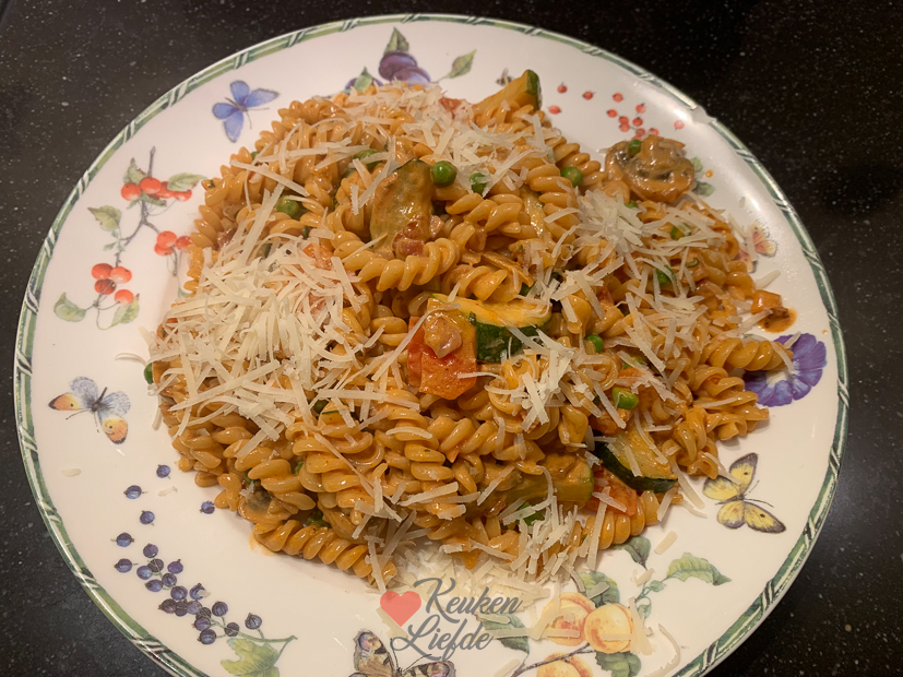 Het is weer een gewone werk- en schooldag als altijd. Johan en Ella-Marie zijn vroeg de deur uit en ik werk thuis op kantoor. Voor het avondeten maak ik pasta met kliekjes groenten uit de koelkast. Champignons, paprika, courgette en ook nog wat doperwten uit de diepvries. Uitje en knoflook fruiten, dan de groenten erbij en even meebakken. Lepel tomatenpuree en verkruimeld bouillonblokje erbij en even meebakken. Dan room erbij en op het laatst handje Parmezaan en gekookte pasta erdoor roeren. In 15 minuten klaar en erg lekker.