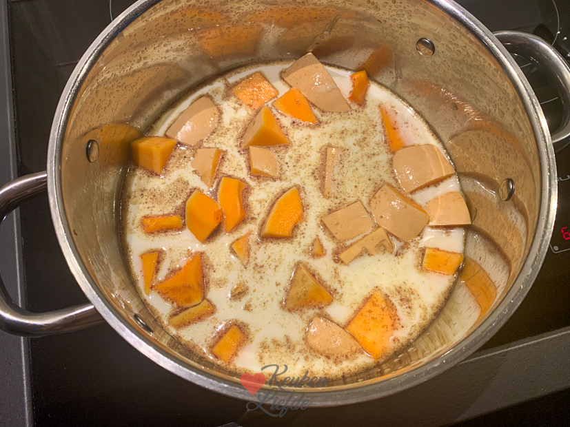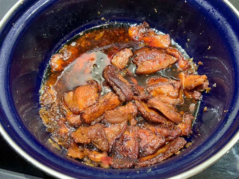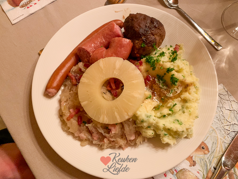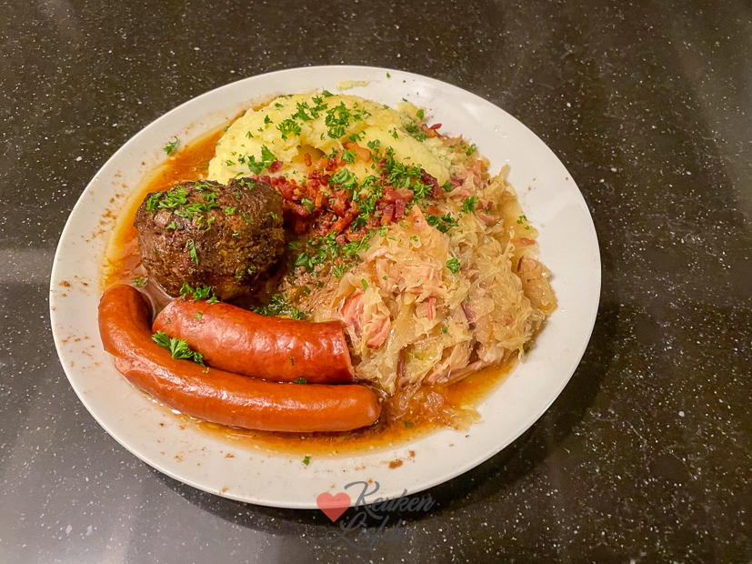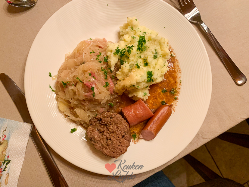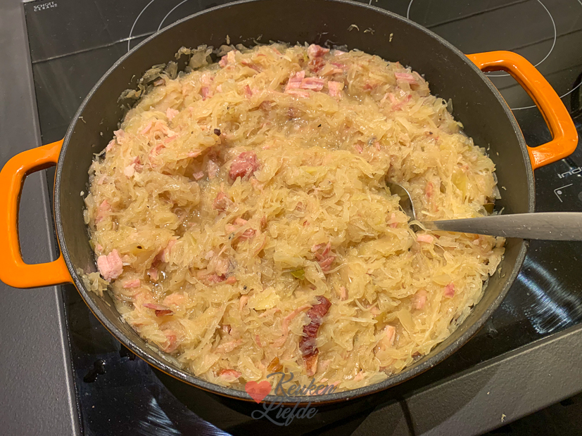 - Als casselerib en zuurkoolspek gaar zijn haal ik ze uit de zuurkool en snijd ik ze fijn (puur vet snijd ik weg). Daarna doe ik ze terug bij de zuurkool. Het vocht bind ik met een geschilde en geraspte, rauwe aardappel. Omdat er dit keer nog heel veel vocht in de pan zat schepte ik een deel van het vocht weg en het overige vocht bond ik met enkele geschilde en fijngeraspte, rauwe aardappels. Zo wordt de zuurkool smeuïg en krijgt hij een zachte smaak. Ik roerde later ook nog wat van het gesmolten vet van de uitgebakken spekjes door de zuurkool en de aardappelpuree.