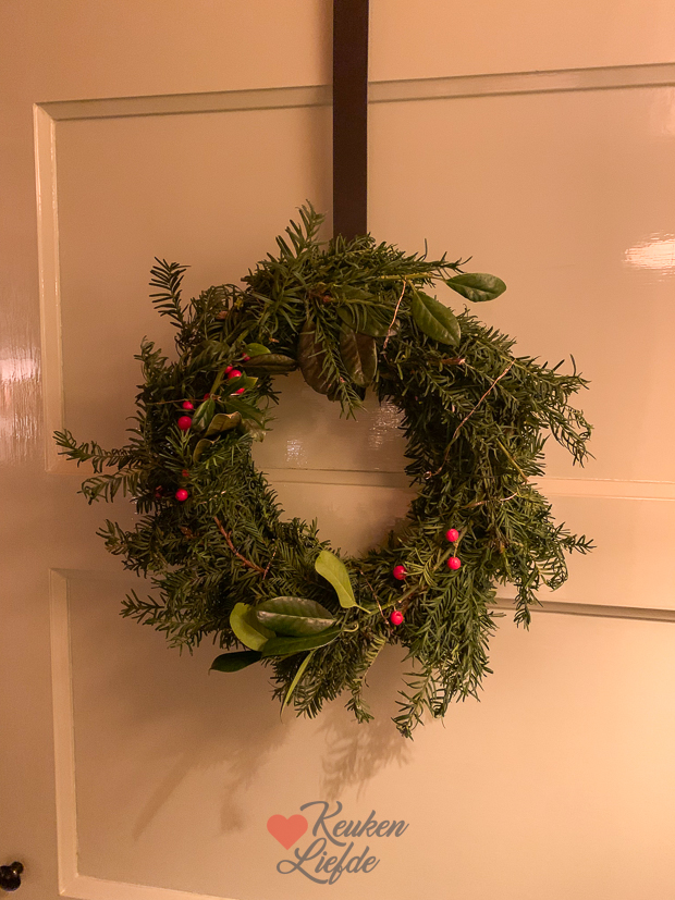 - Deze krans maakte ik van taxustakken en hulst. Er zit ook een lichtsnoer in dat werkt op batterijen.