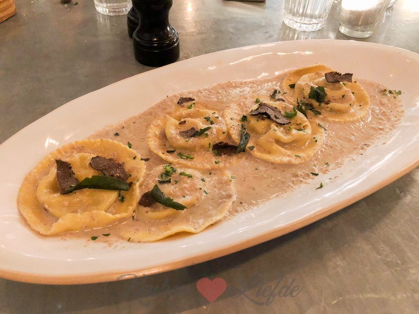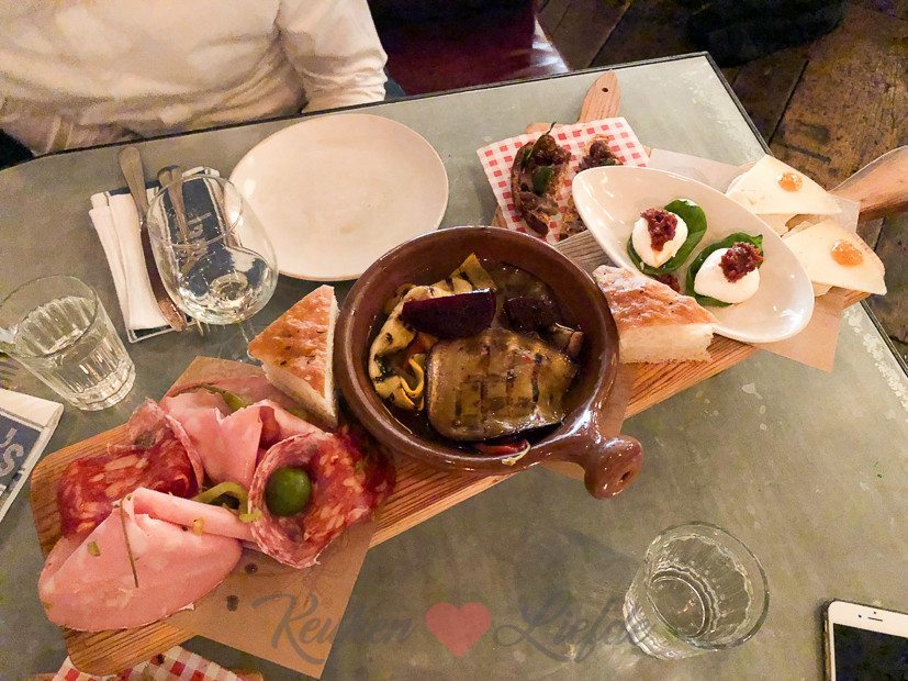 We worden begeleidt naar een tafel in de hoek waar we heerlijk neerploffen op een grote, ronde zitbank. Ella-Marie krijgt meteen een kleurplaat met stiften en een viewmaster waarop ze het kindermenu kan bekijken. Hoe leuk is dat! Ondanks dat het maandagavond is is het gezellig druk in het restaurant. We beginnen met een glas prosecco en delen als voorgerecht de beroemde antipasti plank met Toscaanse venkelsalami, mortadella di Bologna, salami piccante, basilicum met buffelmozzarella, krokante carta di musica (flinterdun brood) belegd met pecorino, olijven, pickles, gegrilde en gemarineerde groenten, huisgemaakte foccacia en geroosterde brioche belegd met kippenleverpaté en vijgenchutney. Eigenlijk is dit gewoon een feestplank! Wat heerlijk!