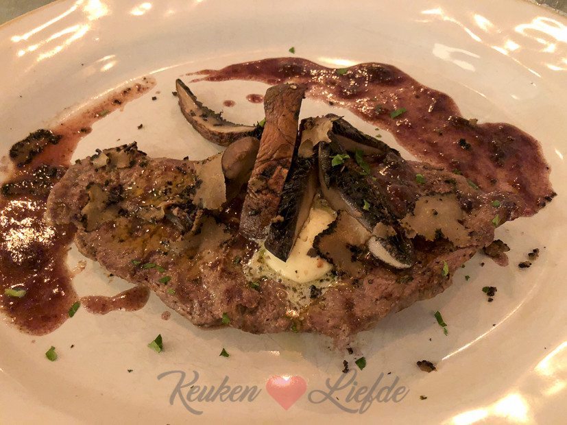 Als hoofdgerecht neemt Johan de truffelsteak (gegrilde featherblade steak ((botermals)), geserveerd met truffelboter, gegrilde portobello en Chianti rode wijnsaus), ik neem de paddenstoelenravioli (ravioli gevuld met eekhoorntjesbrood en fontal kaas met wilde paddenstoelensaus, geschaafde zwarte truffel, tijm, gremolata en vegetarische parmezaan) en Ella-Marie kiest het broodje hamburger met zoete aardappelfriet van het kindermenu.