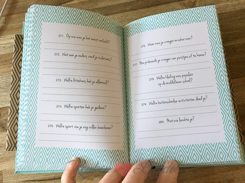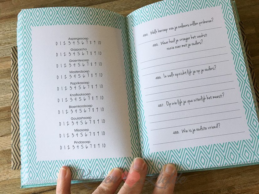 Dit boekje ‘999 vragen aan jezelf’ krijg ik van mijn mediabureau Semilo thuisgestuurd als verjaardagscadeau! Het zijn vragen over alles en iedereen in je leven, van je geboorte tot nu en over de toekomst. Er zijn open vragen, meerkeuzevragen, ja/nee-vragen, tweekeuzevragen, enz. enz. Als je eenmaal alles hebt ingevuld heb je een bijzonder nalatenschap om te geven aan je kinderen, kleinkinderen, of geef aan iemand waarvan je vindt dat die jou beter zou moet leren kennen. Echt een leuk en origineel cadeau!