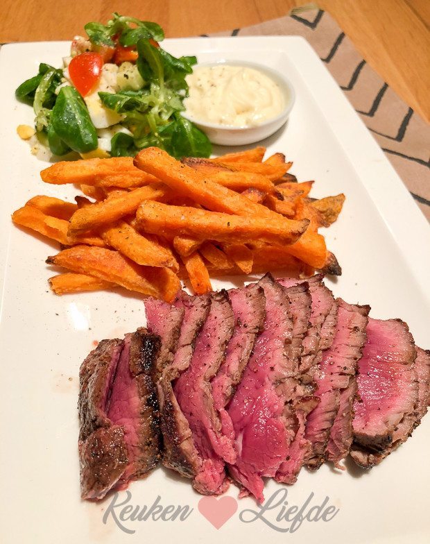’s Avonds eten we gebakken biefstuk met zoete aardappelfriet en salade.