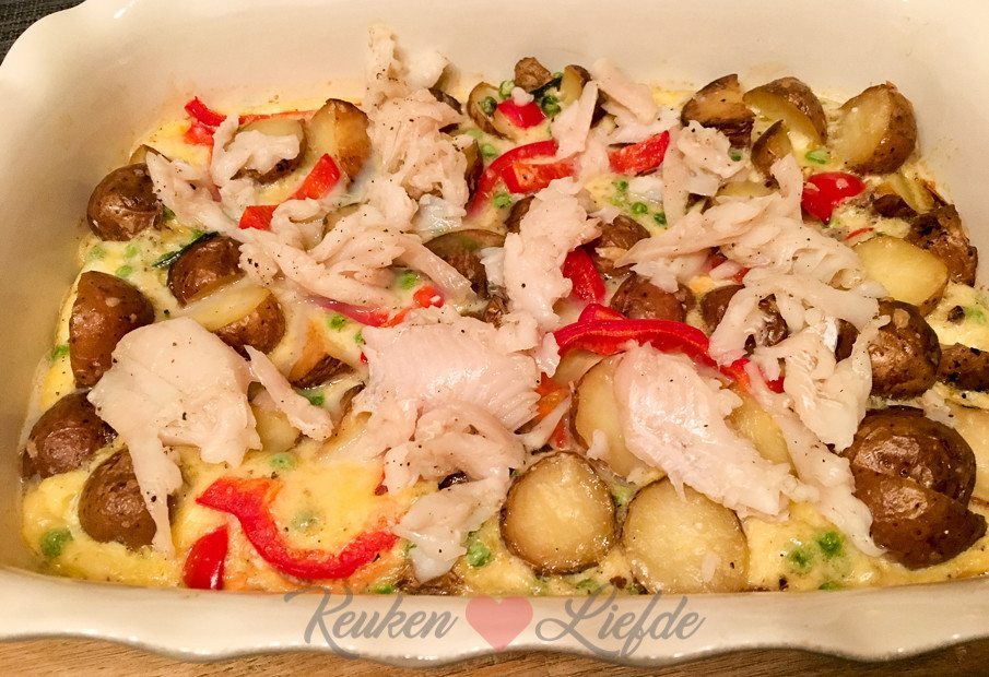 Voor het avondeten trek ik de koelkast open en kijk wat erin ligt. Uiteindelijk maak ik een omelet uit de oven waarin ik allerlei kliekjes verwerk zoals gekookte aardappels, paprika, doperwten en scholfilet. Een prima dinsdagavonddiner.