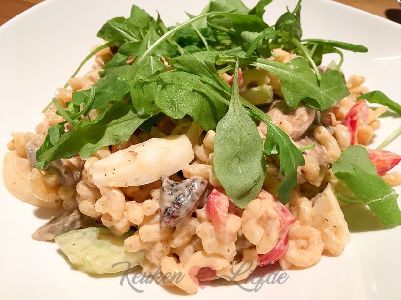 Johan maakt ’s avonds zijn beroemde pastasalade als avondeten. Hier kan ik me dus echt ziek aan eten, zo lekker vind ik het! Dit recept is de basis, maar Johan zijn pastasalade smaakt nooit hetzelfde. Hij mikt er gewoon alles in wat hij vindt in de koelkast. In dit geval zijn dat cherrytomaten, komkommer, olijven, hardgekookt ei, paprika, gedroogde, harde worst en sjalot. De macaronisalade wordt smeuïg gemaakt met mayonaise, soms een druppel maggie, zout en peper, sushiazijn of augurkennat en soms ook wat ketchup. Een toefje rucola maakt het af. 🙂